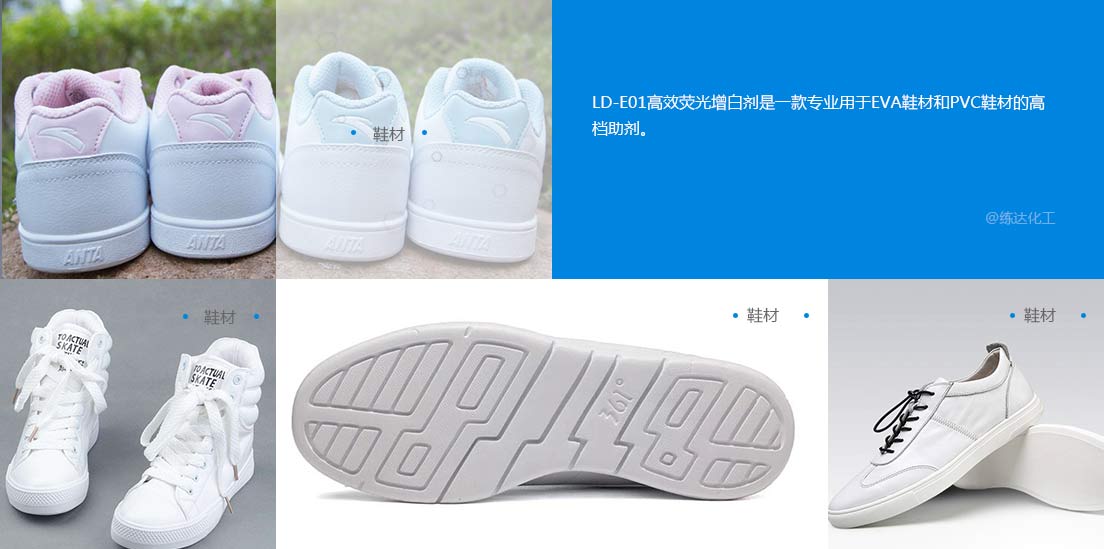 使用范圍廣LD-E01高效熒光增白劑是一款用于EVA鞋材和PVC鞋材的高檔助劑。03